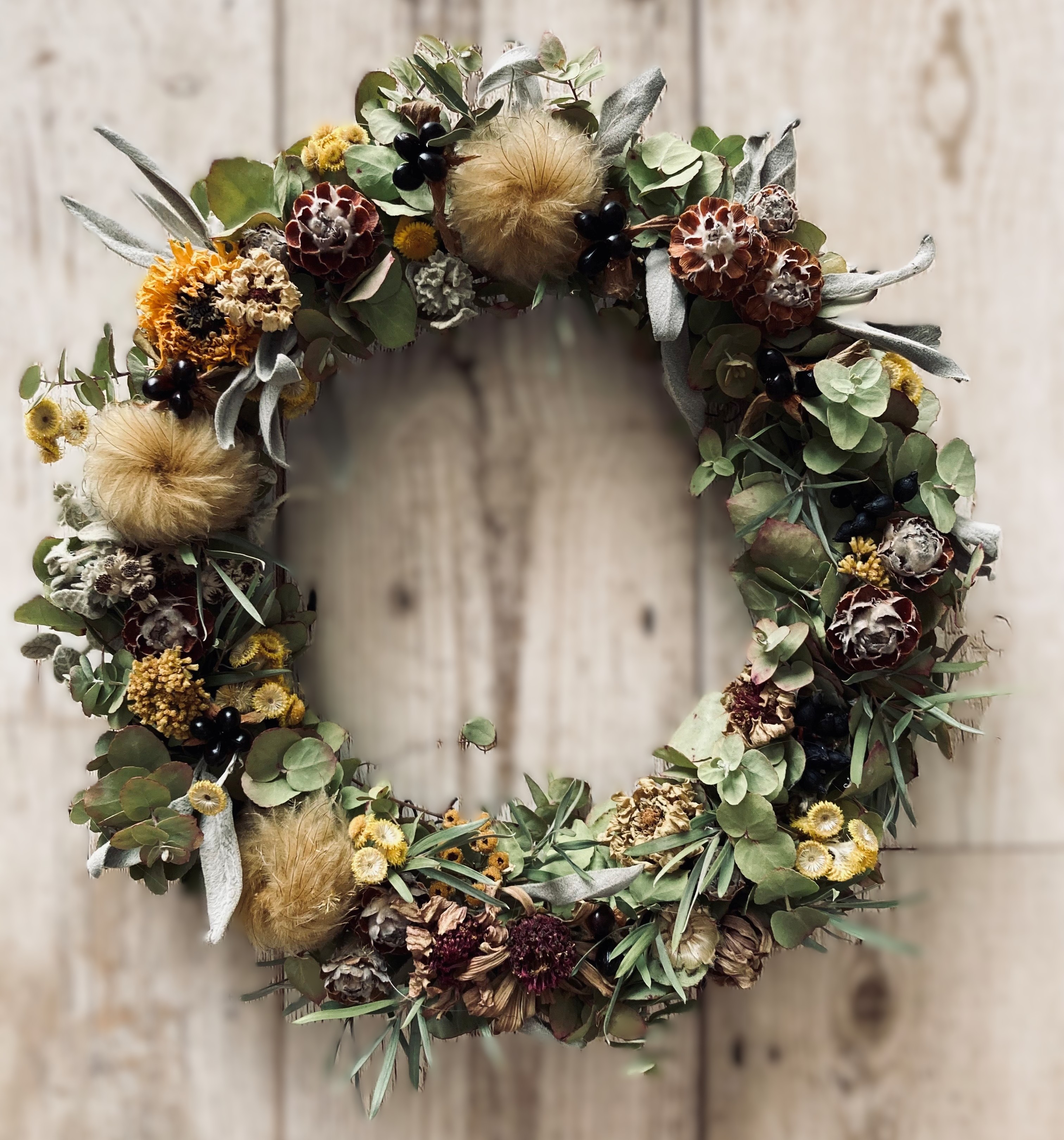 様々なドライフラワーをグルーガンで仕上げて、ふんわり優しい春色のリースを作ります。