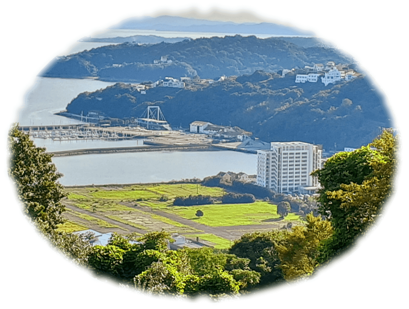 ヨットハーバーやリゾートホテルがみえて、海と島と緑のある瀬戸内らしい風景だよ!